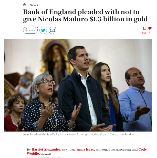 Juan Guaido, who last week declared himself the country’s legitimate ruler and was recognised as such by the US, has written to Mark Carney, the Bank’s governor, to ask him not to hand over the gold to Nicolas Maduro. He also sent the letter to Theresa May, the Prime Minister.