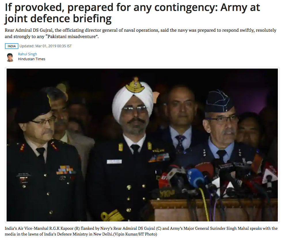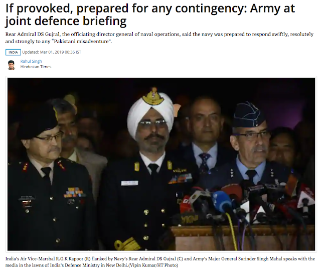 Indian Defense Ministry: "We believe that the Pakistan air intrusion was an attack on military installations. We believe that the Indian Air Force Pilot was ill-treated by the Pakistan Army in violation of the Geneva convention."