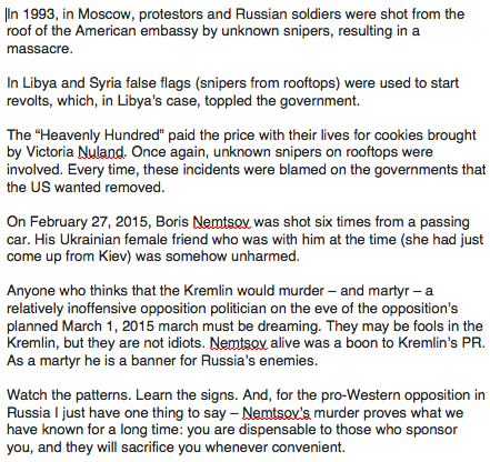 Already in February 2012 (two years ago!) Putin was warning Russians about exactly the kind of false flag which we just saw happening with the murder of Nemtsov. See for yourself: