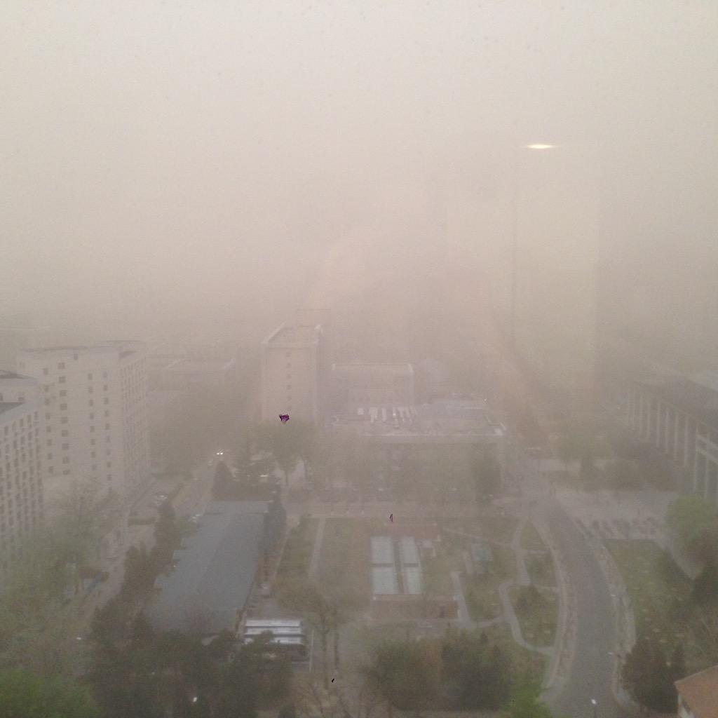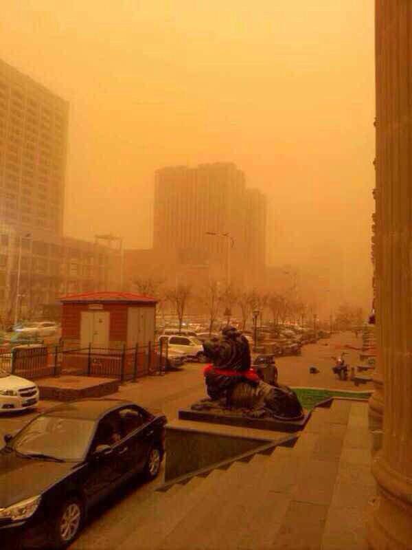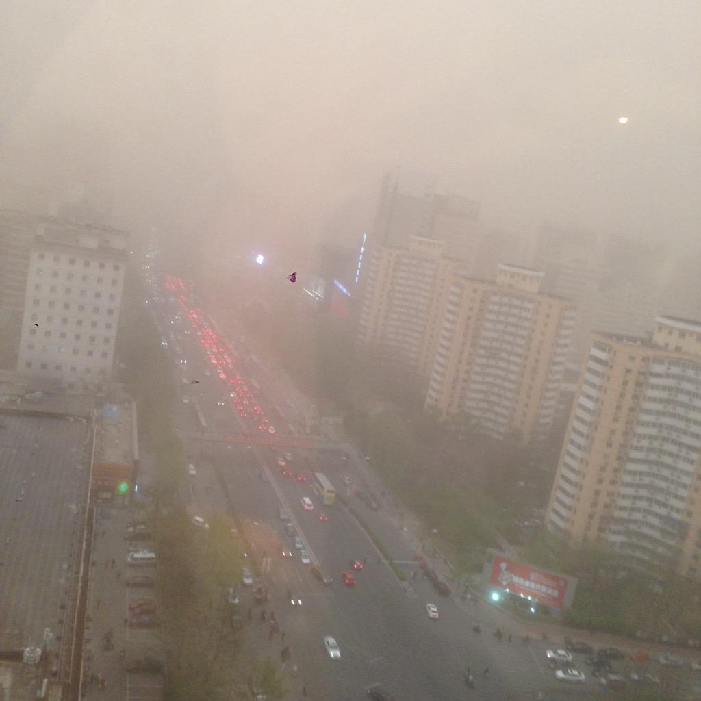 Massive sandstorm rolling into central Beijing, view from our office window: