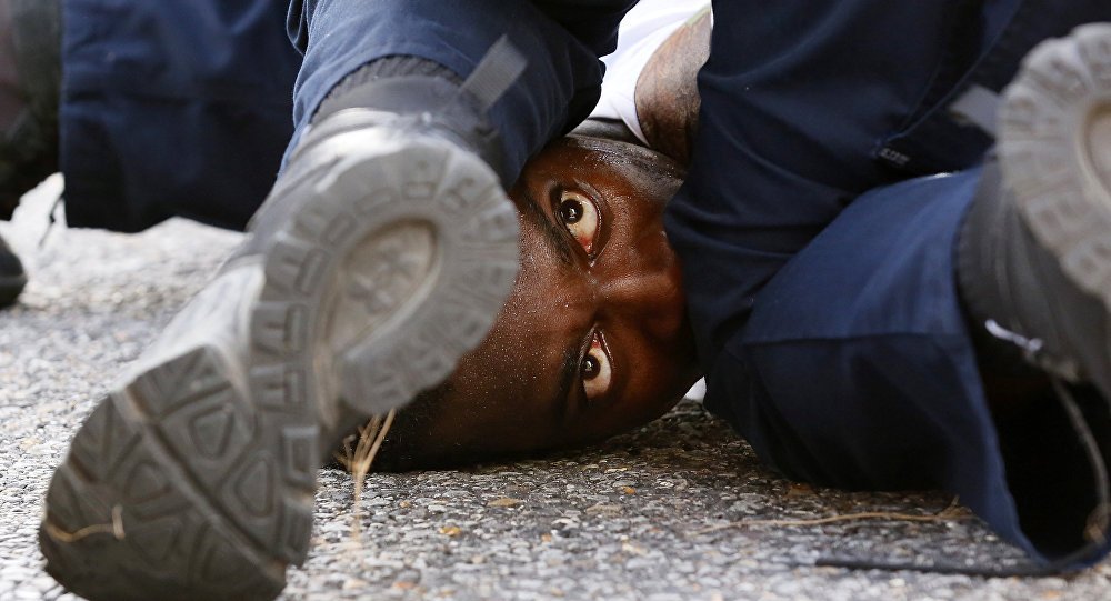 A demonstrator protesting the shooting death of Alton Sterling is detained by law enforcement near the headquarters of the Baton Rouge Police Department in Baton Rouge, Louisiana, U.S. July 9, 2016.  REUTERS/Jonathan Bachman     TPX IMAGES OF THE DAY      - RTSH3XR