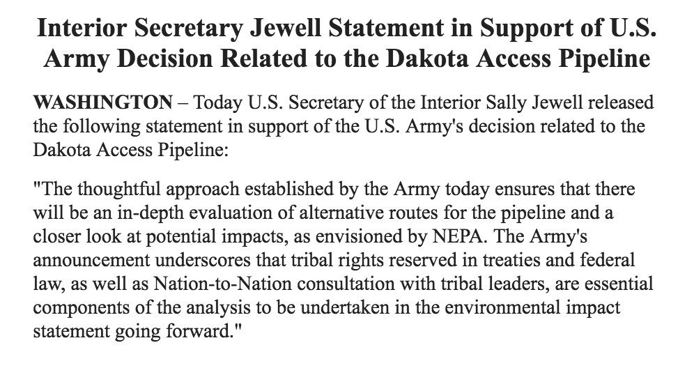 I appreciate @POTUS listening to the Native American people and millions of others who believe this pipeline should not be built.
