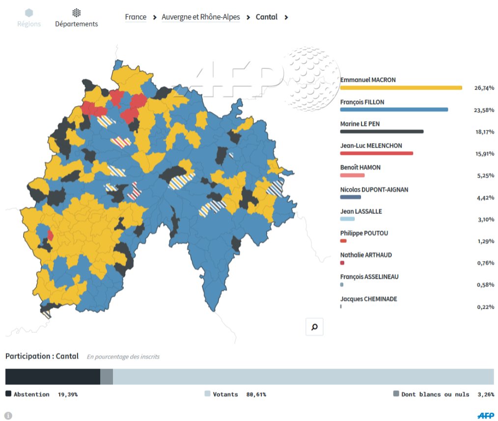 #Presidentielle2017 : dans le Cantal, Emmanuel Macron termine en tête devant François Fillon http://u.afp.com/Resultats2017