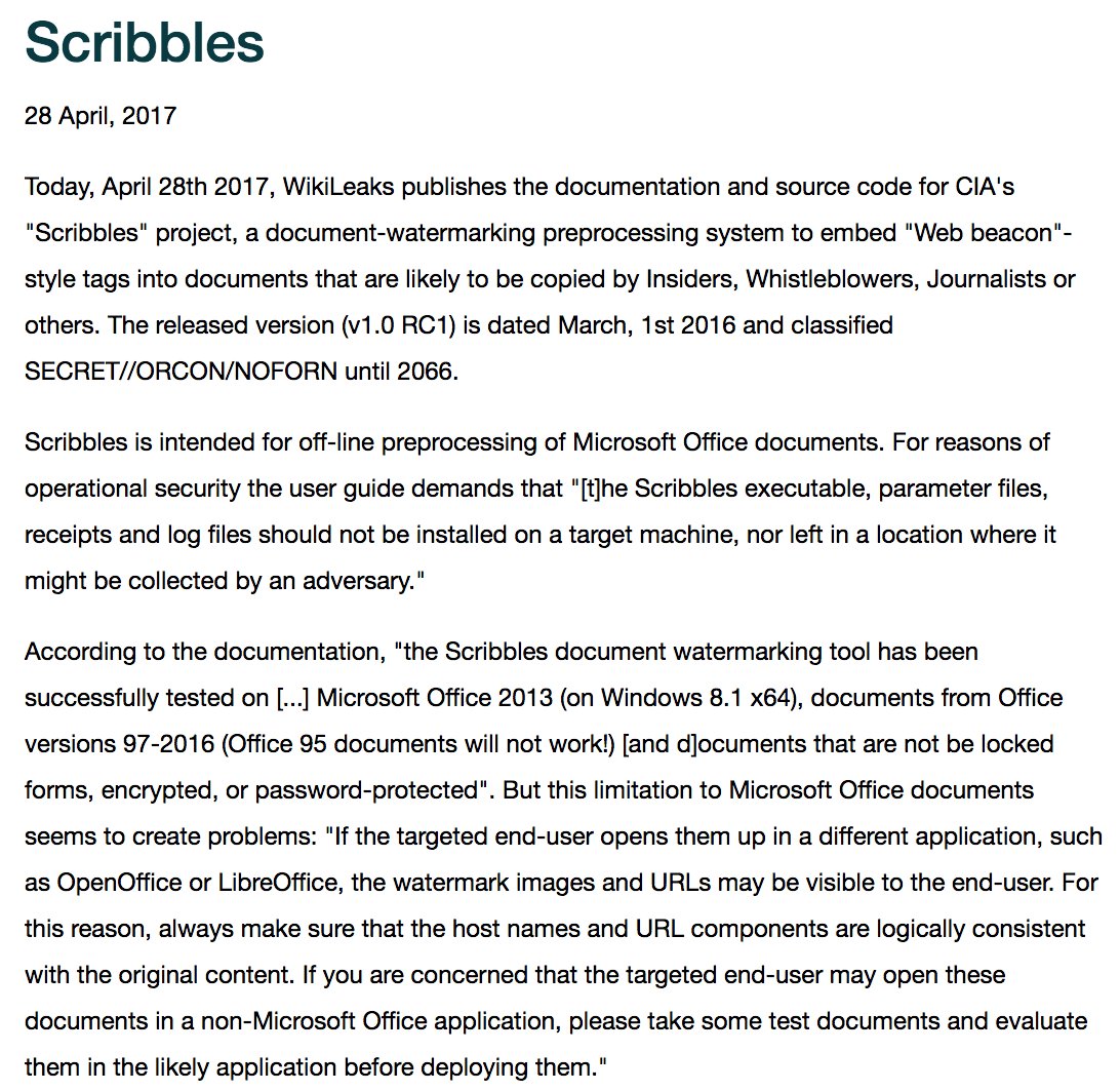 RELEASE: "Scribble" the CIA's secret system to track leakers. Full source code and documentation included. #vault7 https://wikileaks.org/vault7/?scribbles/#Scribbles …