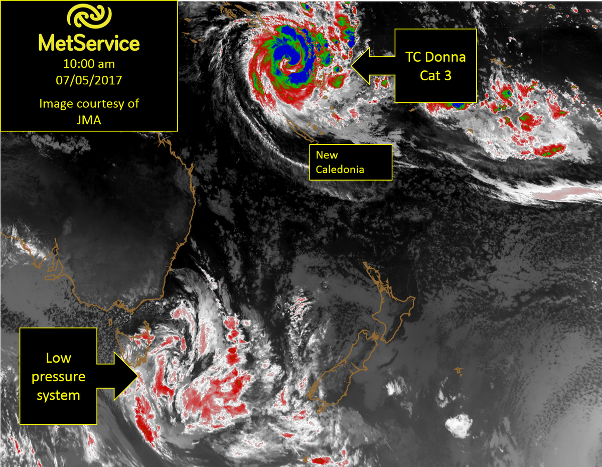 TC Donna not moved much since yesterday, but still expected to pass close to New Caledonia+Vanuatu. Low system to W getting closer to NZ ^TA
