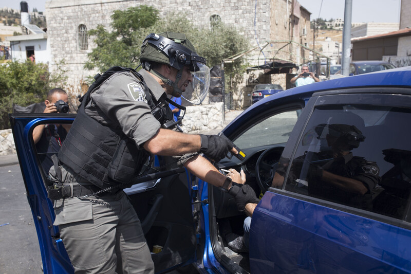 Israeli forces disperse Palestinian worshippers in the Ras al-Amoud neighborhood of Jerusalem after mass prayers were held in the streets in protest of Israeli measures at al-Aqsa mosque, 21 July. Oren Ziv ActiveStills