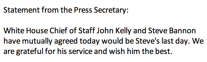 JUST IN: White House on Bannon: "John Kelly and Steve Bannon have mutually agreed today would be Steve's last day." http://abcn.ws/2w9uoQR