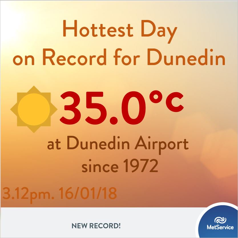 Our weather station at Dunedin Airport recorded 35C at 3.12pm today (minute data), which would make this the hottest day on record for Dunedin Airport since records began in 1972. ^Lisa