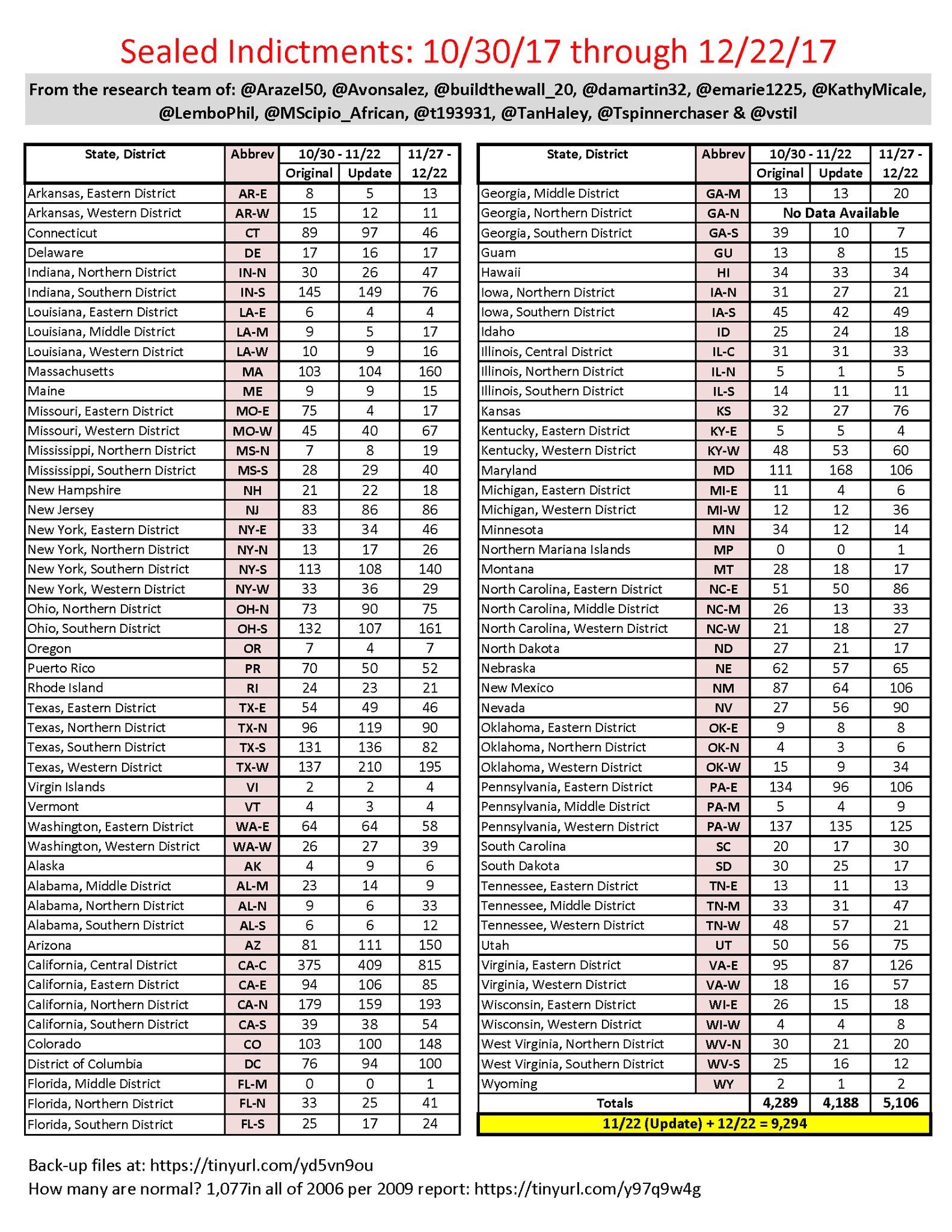 2017, there are now 9,294 total SEALED federal cases/Indictments in