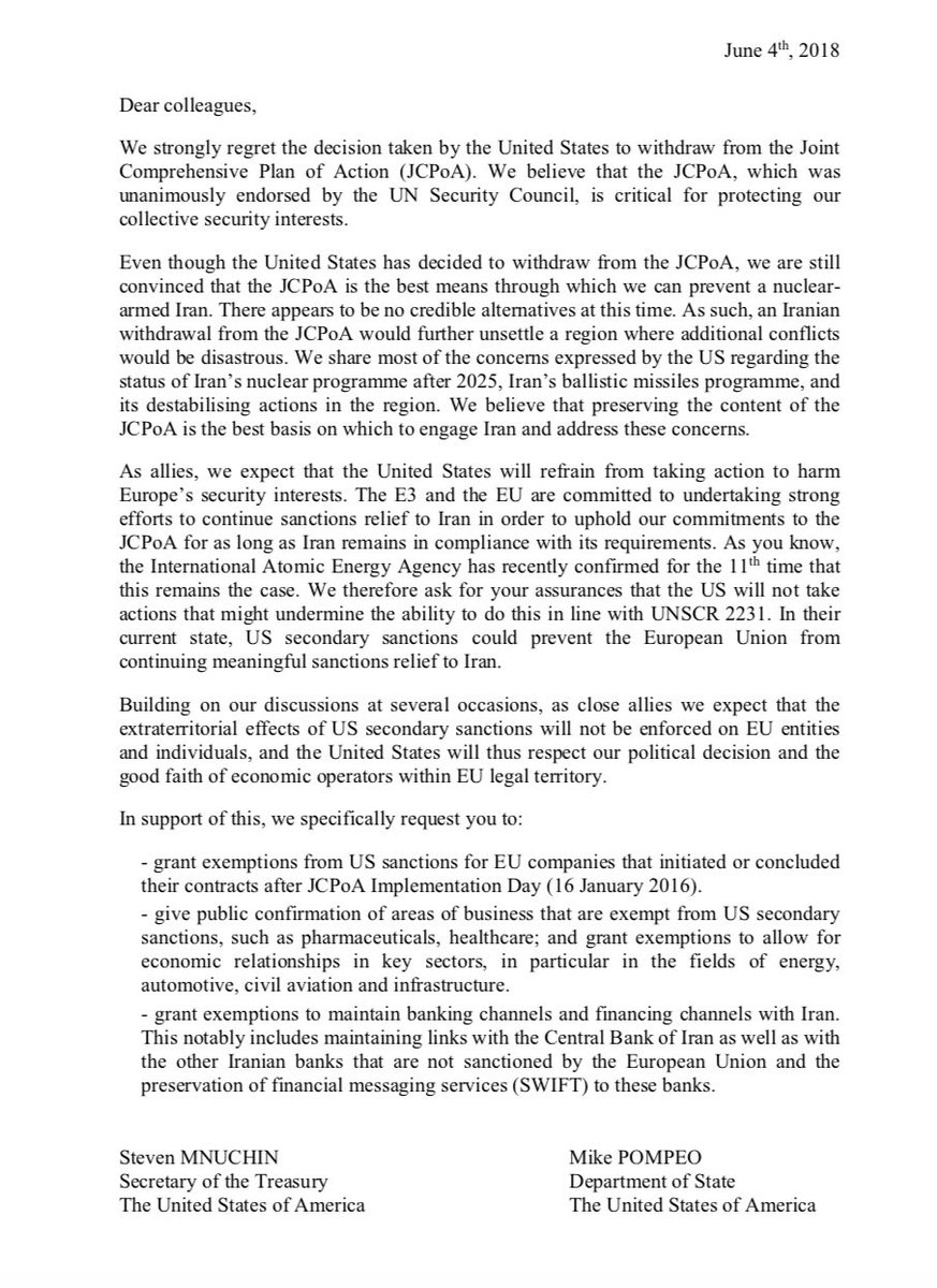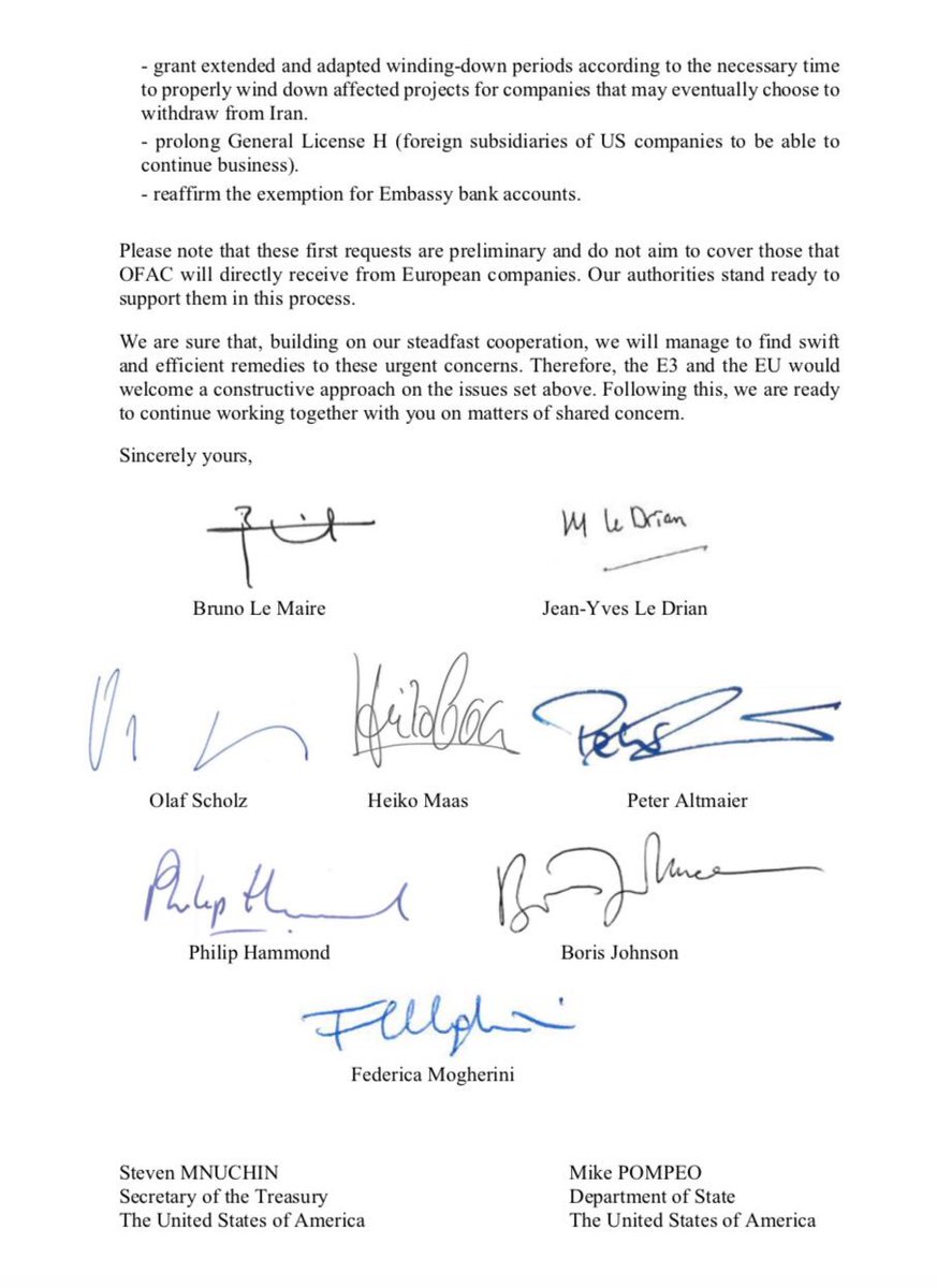 We ask the American authorities, in a letter signed with Germany, the UK and @eu_eeas to exempt European businesses doing legitimate trade in Iran from all extraterritorial American sanctions. Those businesses must be able to pursue their activities.
