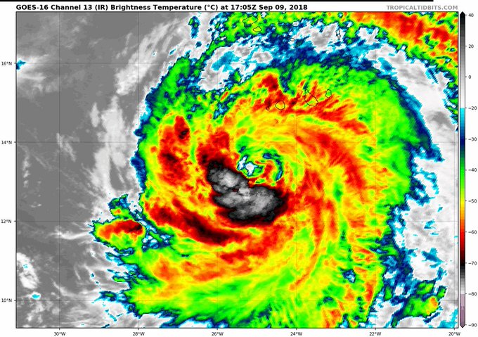 The fourth hurricane of the 2018 Atlantic hurricane season is Helene, which intensified into a Category 1 storm with 75 mph winds at 5 pm EDT Sunday in the waters 145 miles southwest of the southernmost Cabo Verde Islands. Helene brushed the Cabo Verde Islands with heavy rain showers and strong wind gusts, but the islands missed the brunt of the storm. The Hurricane Watch and Tropical Storm Warning that were in effect for the three southernmost Cabo Verde islands, Santiago, Fogo, and Brava, has been dropped.