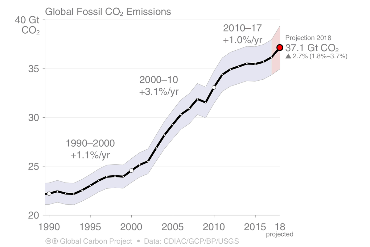 BREAKING: Global carbon emissions have begun to accelerate upwards again in 2017 and 2018, after a three-year lull.