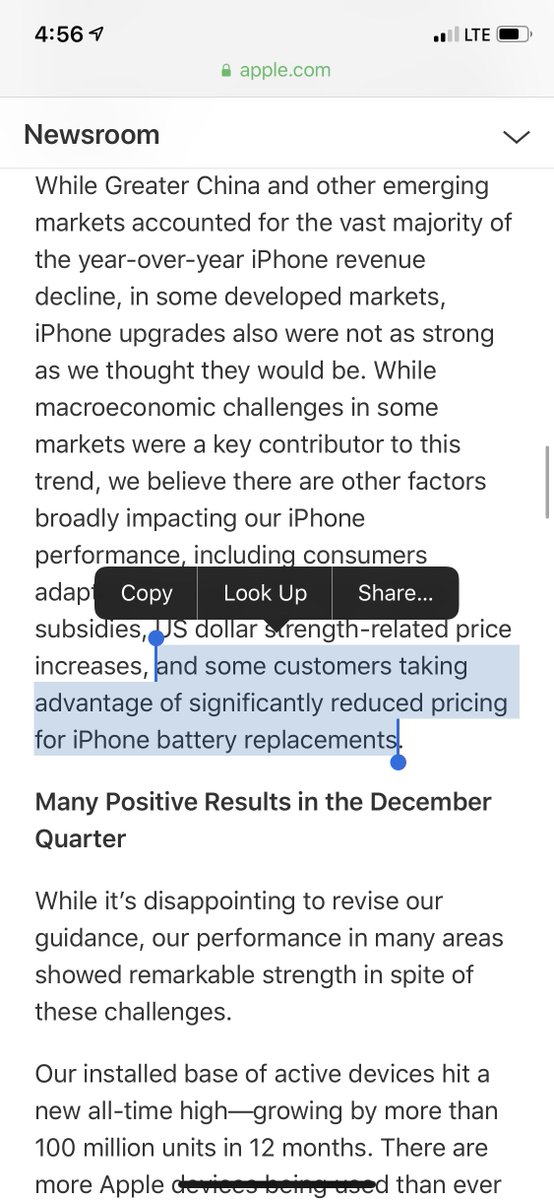 Not sure Cook should have listed this as a reason for slower than expected iPhone sales. Sure makes it sound like the old way of handling battery degradation was intended to drive people to buy new phones.